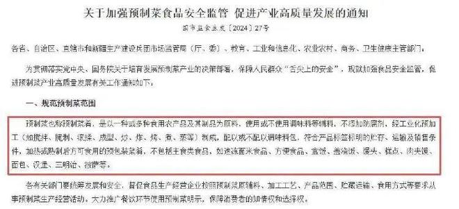 预制菜究竟是什么?速冻包子、饺子加热即食,包装酸菜鱼解冻加热,这些算不算预制菜?2024年3月,市场监管总局等六部门联合印发的通知给出了明确界定。预制菜是以食用农产品及其制品为原料,经工业化预加工制成,需加热或熟制后食用的预包装菜肴。同时,连锁餐饮中央厨房向自有门店配送的净菜、半成品,以及主食类食品等不纳入预制菜范围。食品产业分析师朱丹蓬指出,预制菜有两大硬性要求,一是禁止添加防腐剂,二是必须全程冷链,以确保食品的自然健康与新鲜安全。