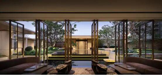 穿过归家会客厅,一幅复刻广邸特色珠江骑楼风景的三叠式中心水院—「珠水画境」便徐徐打开。水景两侧分别镶嵌巴西发光奢石--雪山银狐,与水景交相辉映;中央水院边界嵌入下沉式会客区,三面自然围合,宛如坐在珠江岸边般惬意;风雨连廊连接超级泛会所,现代艺术与岭南园林的交相辉映,移步异景。